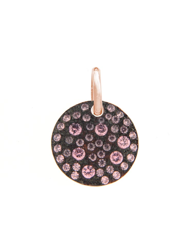 Pendente pavè in argento 925 di forma tonda con uno studio particolare di incassatura mista, arricchito da pietre taglio brillante di svariati colori e dimensioni. Fatto in Italia. (Diametro 16 mm)