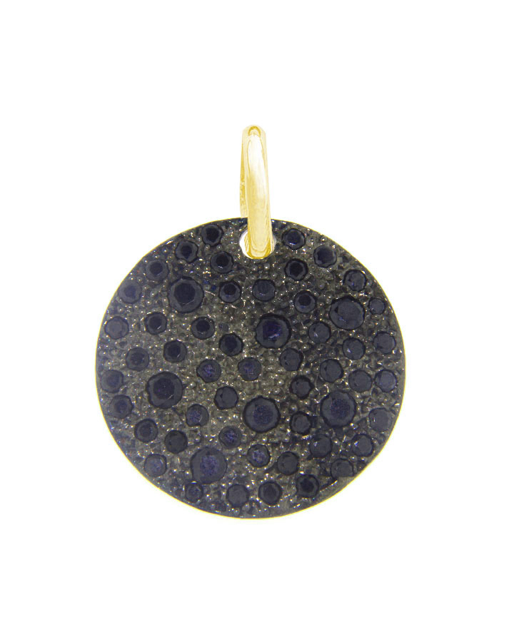 Pendente pavè in argento 925 di forma tonda con uno studio particolare di incassatura mista, arricchito da pietre taglio brillante di svariati colori e dimensioni. Fatto in Italia. (Diametro 22 mm)