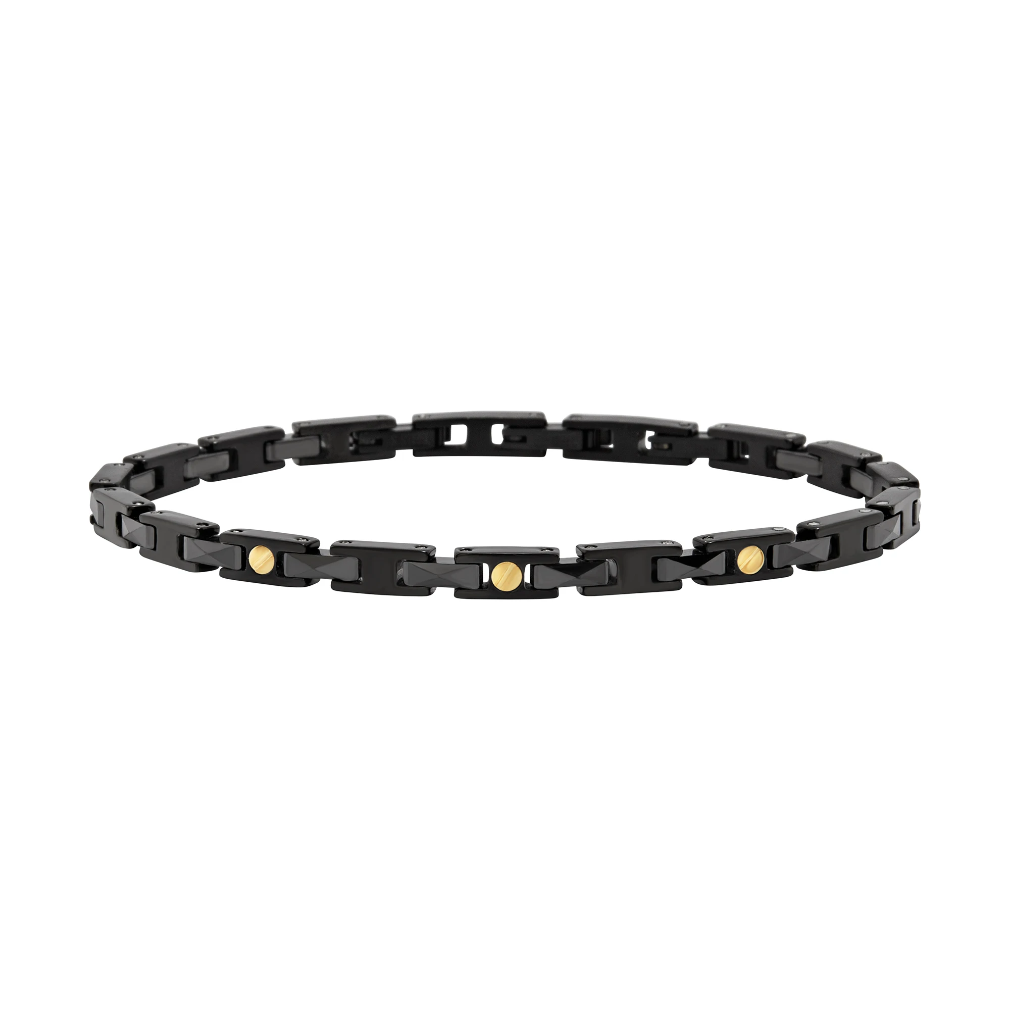 Il bracciale Ceramic Brick si distingue per l’alternanza di elementi in ceramica nera e dettagli in acciaio lucido black, un connubio che crea un contrasto audace e contemporaneo. Tre viti gold, posizionate con cura, aggiungono un tocco di luce che valorizza ulteriormente il design. La chiusura a gioielleria consente di regolare facilmente la lunghezza del bracciale, garantendo una vestibilità perfetta e confortevole.