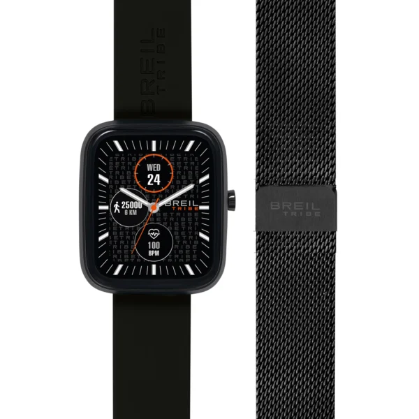Lo smartwatch SBT-3 è versatile e adatto ad ogni momento della giornata. Viene infatti venduto con due diversi cinturini, uno in morbido silicone e uno in acciaio con maglia mesh, facilmente intercambiabili e abbinabili alla cassa rettangolare in ABS 37,8 x 44,5 mm. Oltre ai diversi quadranti originali Breil già caricati è possibile aggiungerne e personalizzarne altri scaricandoli dall’App. A seconda degli utilizzi, la batteria ha una durata di circa 7 giorni se caricata correttamente. L’App BREIL SMARTWATCH è compatibile con iOS 13.0 e Android 7.1 o versioni successive e BT 5.2. Oltre a monitorare 15 sport (tra cui: corsa, ciclismo, scalata, yoga, tennis, fitness…) ha innumerevoli altre funzioni: chiamata bluetooth, notifica di chiamata e di messaggi, controllo scatto foto, meteo, pedometro, anti smarrimento, controllo musica, calorie, frequenza cardiaca, relax, monitoraggio ossigeno nel sangue, ciclo mestruale, monitoraggio del sonno. Lo smartwatch è dotato di una certificazione IP68: il dispositivo risulta completamente protetto dalla polvere ed è in grado di resistere a pioggia, spruzzi e immersioni accidentali. A questo scopo, è testato in laboratorio per resistere in acqua a temperatura controllata fino ad una profondità di 3 metri in assenza di pressioni. Non è consigliato per bagni, sauna, bagno turco e nuoto: l’elevata pressione potrebbe danneggiare i componenti dell’orologio.