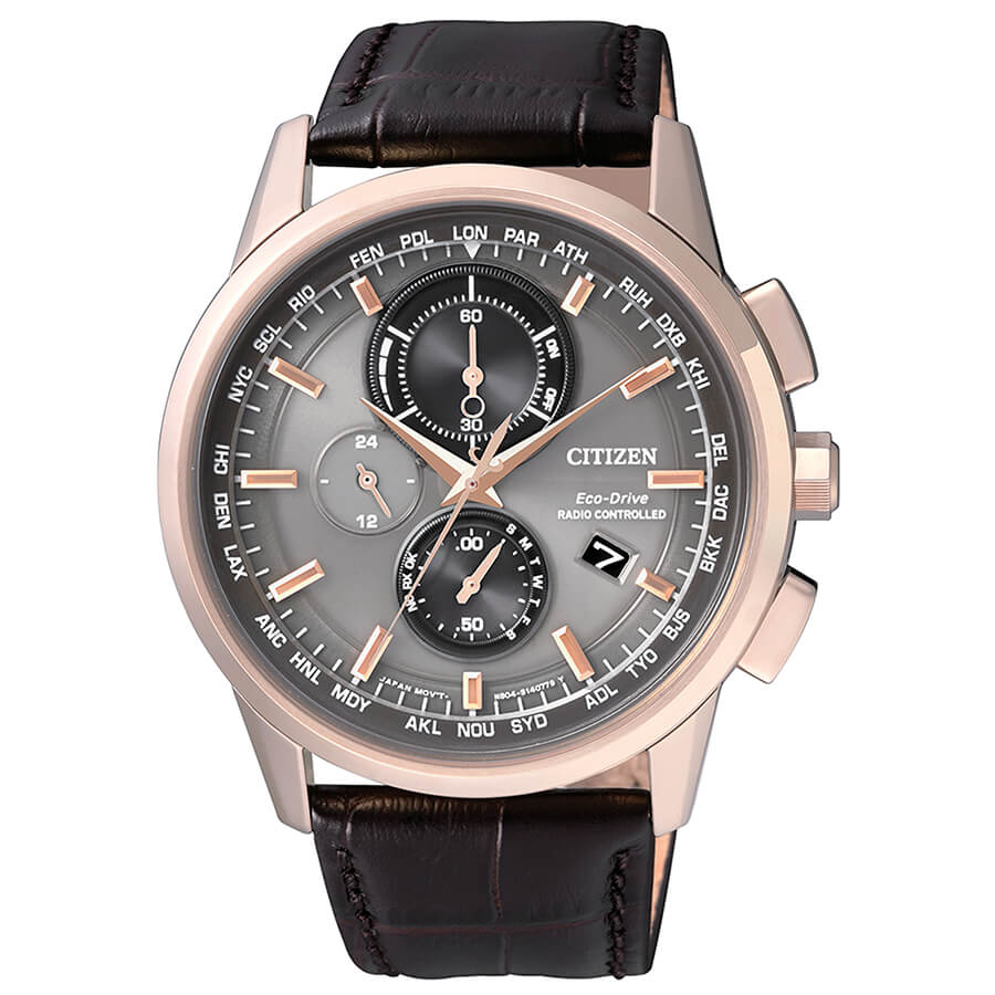 Radiocontrollato a 5 canali: ricezione segnale orario USA, Europa, Giappone, Cina. World time con orario di 26 città del mondo e ora UTC. Cronografo a 1/5 di sec. Calendario perpetuo.