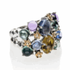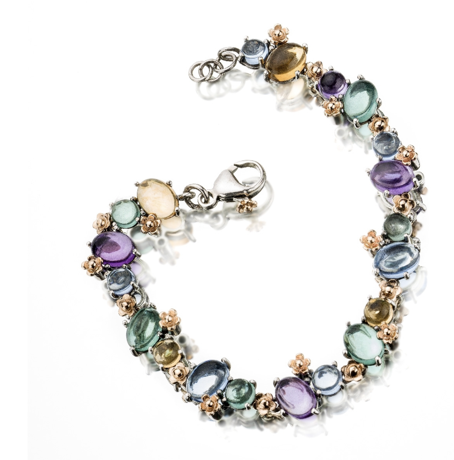Bracciale realizzato a mano, esclusivamente nel laboratorio de’ Nobili, in argento 925 e oro rosa 9kt con cabochon di quarzi idrotermali.
