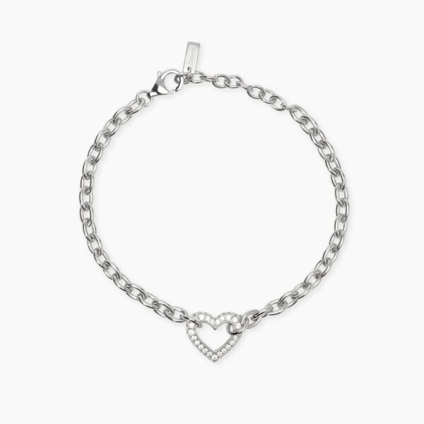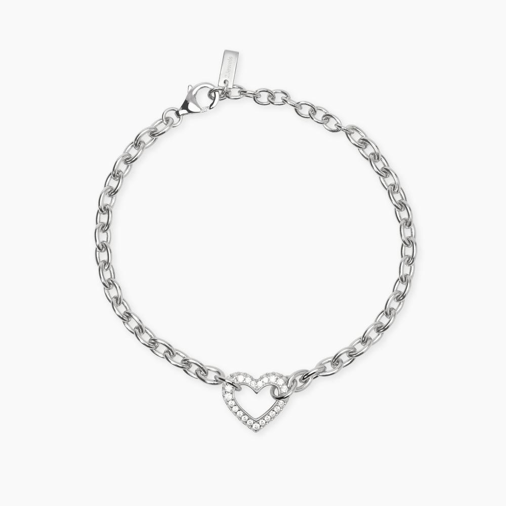Bracciale regolabile in argento rodiato con catena rolò e cuore in zirconi bianchi.
