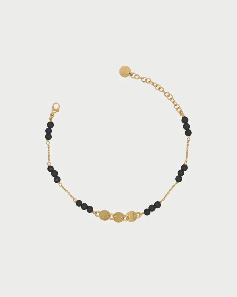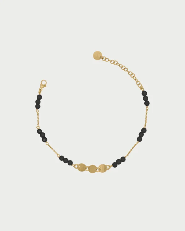 Braccialetto in argento 925 dorato con catena intervallata da zirconi milky e tre medagliette centrali. Un mix di luce e simboli in perfetto stile gipsy.