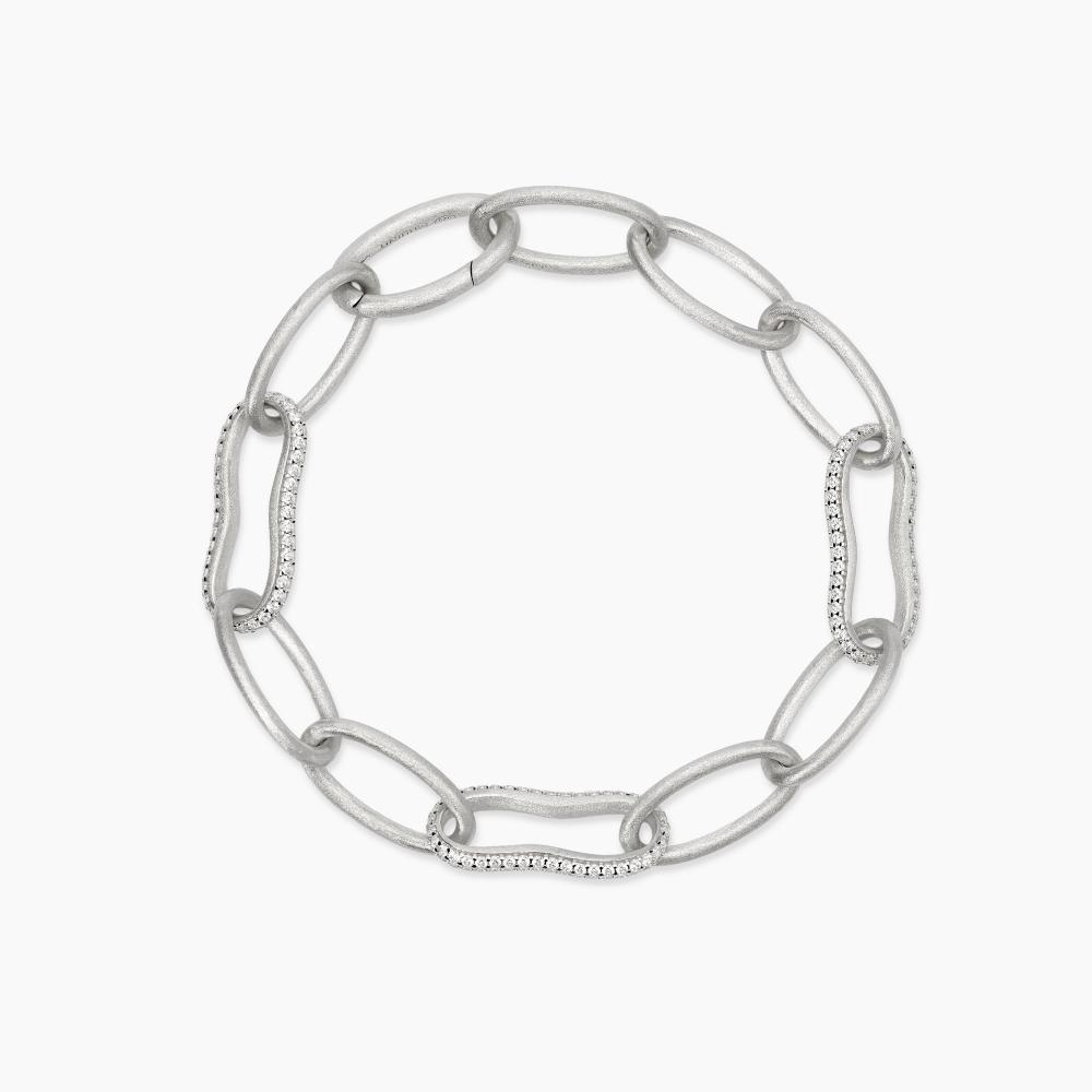 Bracciale in argento rodiato bulinato con catena a maglia ovale ed elementi con zirconi.