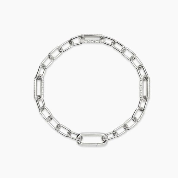 Bracciale in argento rodiato con maglie allungate e elementi in zirconi bianchi.
