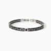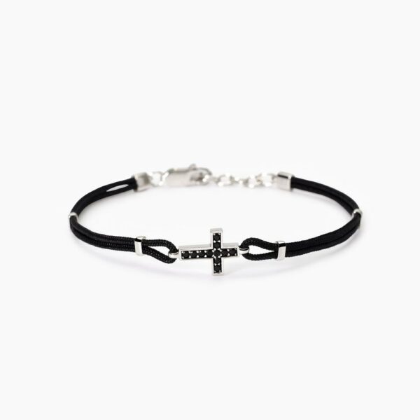 Bracciale regolabile da uomo in argento rodiato con cordino in nylon nero ed elemento croce con zirconi neri.