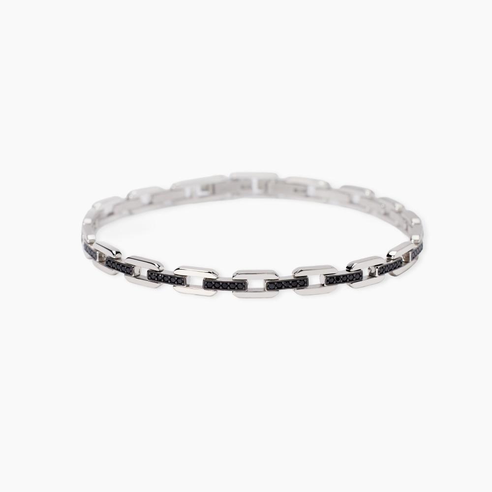 Bracciale in argento rodiato con catena a maglie imperniate e zirconi neri. Chiusura in acciaio.