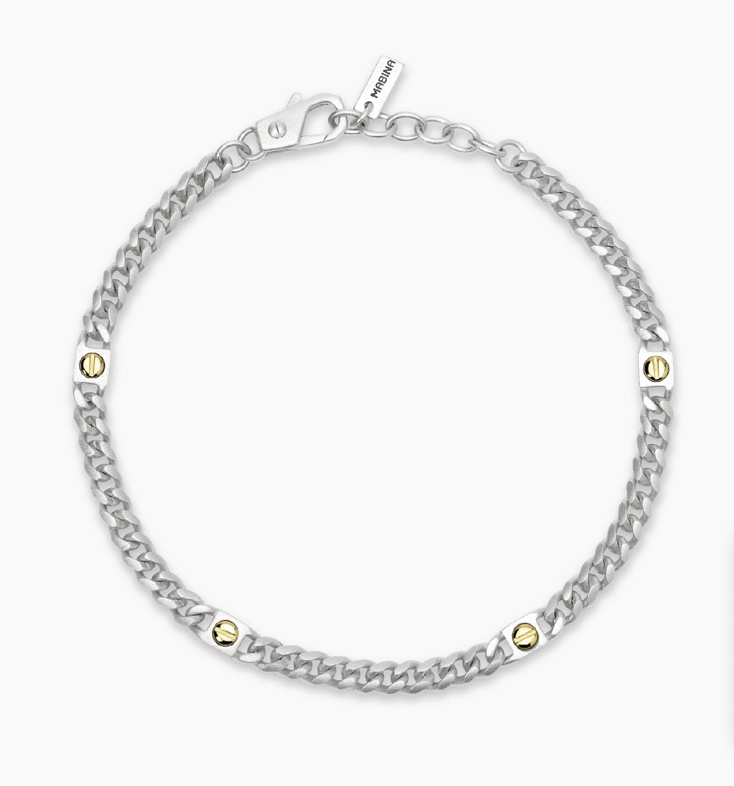 Bracciale uomo regolabile in argento rodiato sabbiato con catena groumette diamantata ed elementi con viti placcate oro 18K.