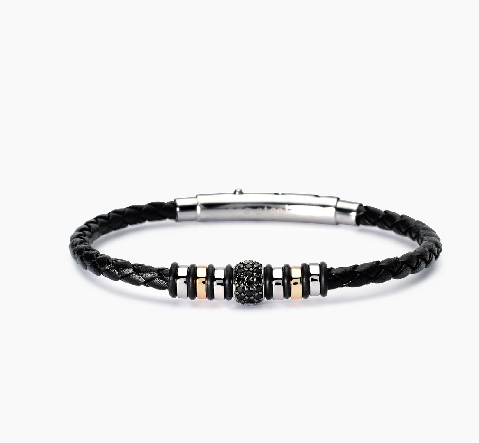 Bracciale regolabile da uomo in argento rodiato con lab leather nera intrecciata, elemento centrale con zirconi neri ed elementi in argento lucido e placcato oro rosa.