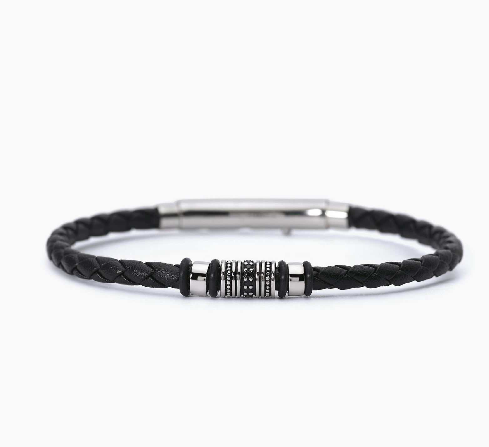 Bracciale da uomo in argento rodiato in lab leather, acciaio e zirconi neri.
