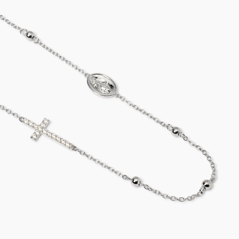 Girocollo in argento con catena forzatina, forma croce in zirconi bianchi e Madonnina.