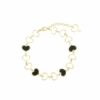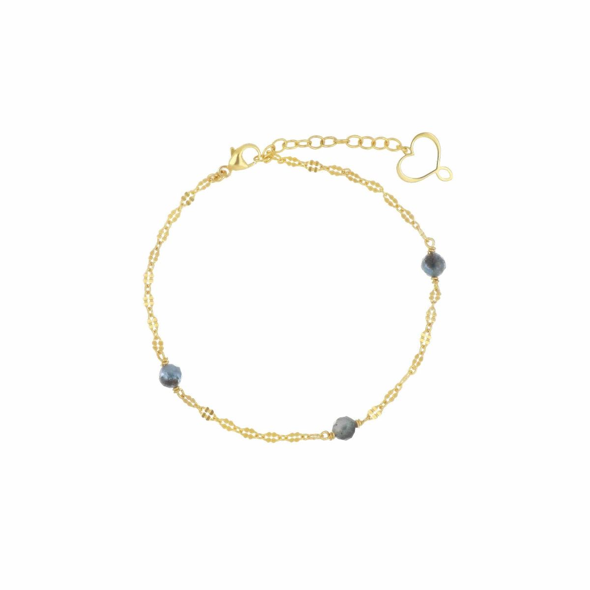 Bracciale in argento 925 con galvanica oro giallo ad alto spessore e ad alta resistenza. Il bracciale presenta tre pietre di acquamarina scura sfaccetata di dimensione 4 mm.