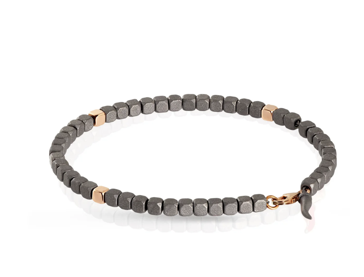 Bracciale da uomo in titanio, oro rosso 9 KT e piccolo charms in titanio. Una serie di cubi piccoli in titanio e 3 cubi in oro rosso 9KT compongono la struttura principale del bracciale. Una catenina in titanio attraversa l’intera sezione dei cubi cosi il bracciale risulta resistente e mobile. Il bracciale termina con un anellino in oro rosso 9 kt e una chiusura a gancio in oro rosso 9 kt e il charms in titanio pendente che donano un tocco di preziosità. Il simbolo del marchio MANO|J.,il diamante black da 1 punto si trova incassato ad uno degli ultimi cubi. Facilmente indossabile e adattabile ad ogni polso.