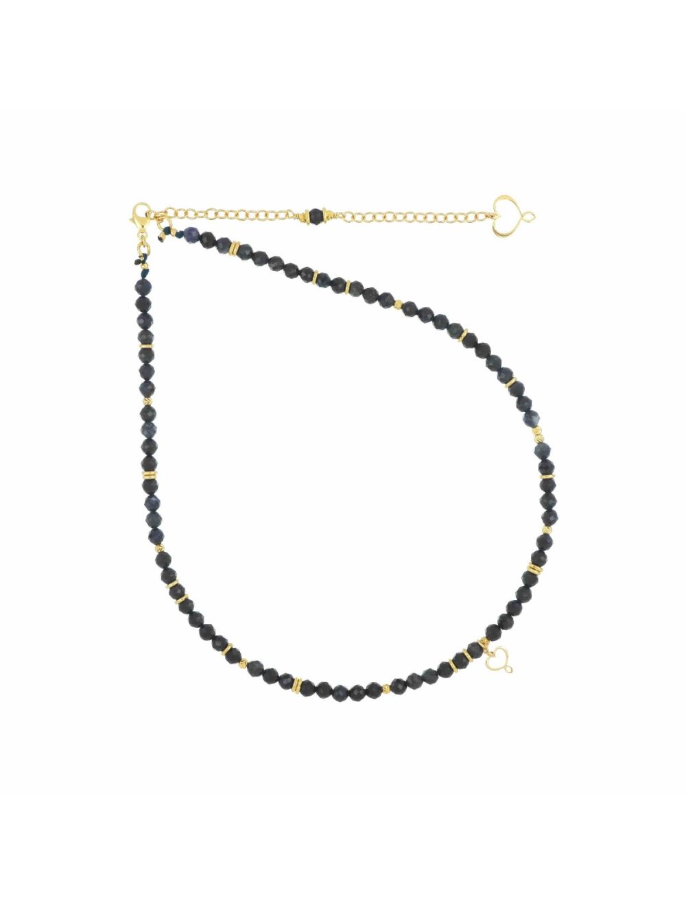 Girocollo in argento 925 con galvanica oro giallo ad alto spessore e ad alta resistenza. Il girocollo è ricoperto per tutta la sua superficie da pietre di zaffiro blu scuro sfaccettato alternate ad elementi decorativi in argento. Presenta al centro mini cuore maman pendente.