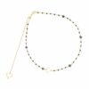 Girocollo in argento 925 con galvanica oro giallo ad alto spessore e ad alta resistenza. Il girocollo presenta sette pietre di acquamarina scura sfaccetata di dimensione 4 mm.