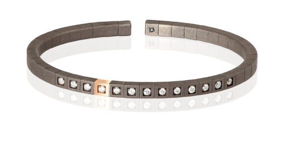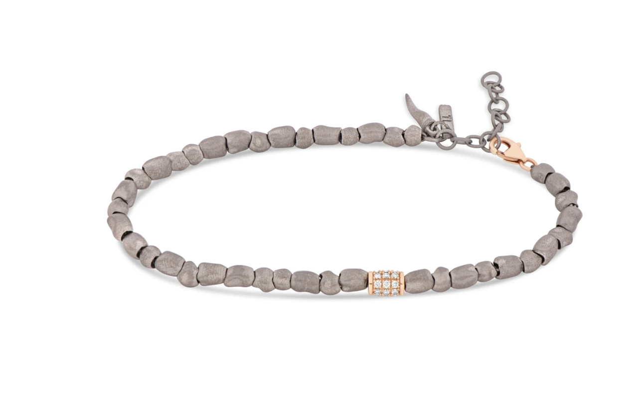 Un gioiello originale che racchiude in sè una personalità decisa adattandosi allo stesso tempo ad ogni occasione. Una fila di sassi in titanio scorrono attraverso una robusta catena interna dello stesso materiale, terminando con una preziosa chiusura con moschettone in oro rosso ed un piccolo cornetto pendente. Tra i sassolini in titanio è inserito un barilotto in oro rosso 9 kt incassato con brillanti brown, per una catatura totale di 0,24 ct. Il testimonial del marchio MANO|J., il brillante black da un punto, è incastonato sopra la targhetta in titanio pendendo alla chiusura.