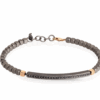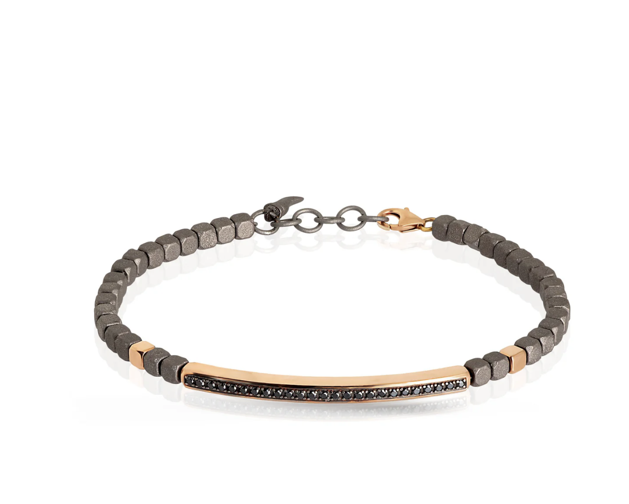 Bracciale uomo in titanio, 25 diamanti black ,2 cubi in oro rosso 9kt e anellini in oro rosso 9 kt con chiusura oro rosso 9 kt e un cornetto in titanio pendente all’ultimo anellino. Una barretta in oro rosso 9kt, sulla quale sono incastonati 25 diamanti black da 1 punto per una caratura totale di 25 punti, è l’elemento principale del bracciale. Una catenina attraversa l’intera sezione dei cubi e della barretta cosi il bracciale risulta resistente e mobile. Alla fine della catena troviamo la chiusura in oro rosso 9kt e il cornetto in titanio. Il marchio MANO|J., impresso al laser sulla parte inferiore della barretta, è accompagnato dall’immancabile diamante black da 1 punto testimonial del brand.Un comodo e prezioso bracciale che per leggerezza e manifattura, permette massimo comfort e adattabilità ad ogni polso.