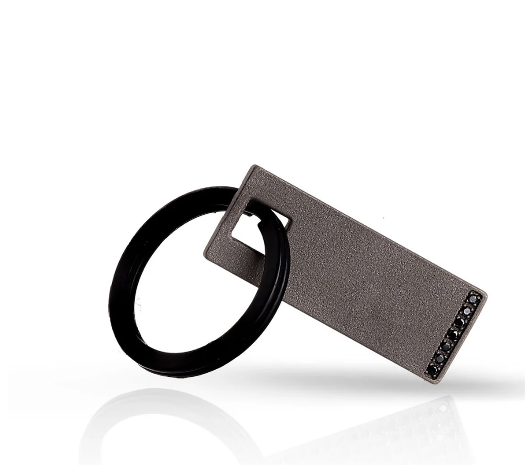 Portachiave con targhetta in titanio. I protagonisti del portachiave sono i 7 diamanti black da 1 punto, per una caratura totale di 7 punti, che si posizionano nella parte inferiore della targhetta. Il marchio MANO|J., impresso al laser sulla parte posteriore della targhetta, è accompagnato dall’immancabile diamante black da 1 punto testimonial del brand.