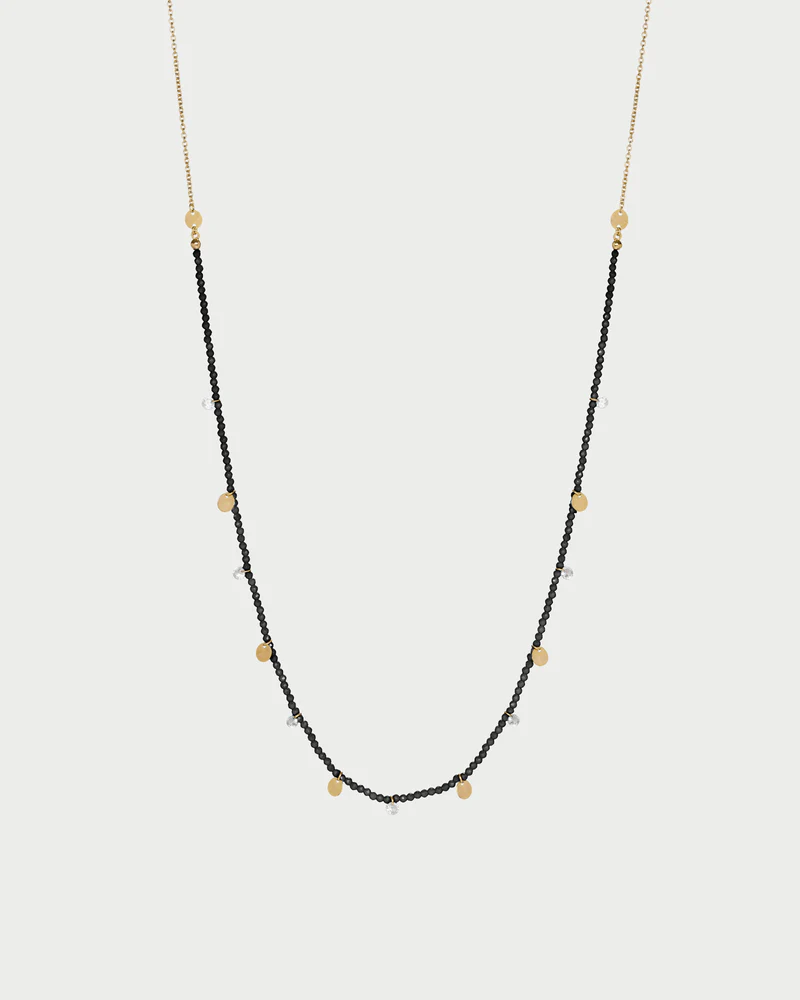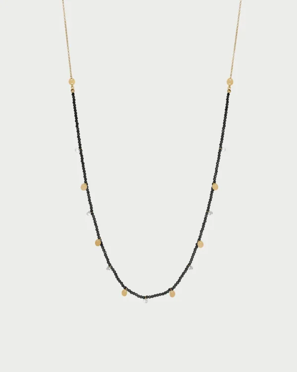 Collana lunga 90 cm, con pepite di zirconi milky, catena in argento dorato, zirconi nudi colorati pendenti e medagliette. Un mix di luce e movimento dal fascino boho-chic.