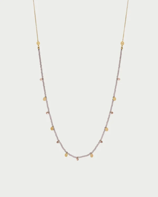 Collana lunga 90 cm, con pepite di zirconi milky, catena in argento dorato, zirconi nudi colorati pendenti e medagliette. Un mix di luce e movimento dal fascino boho-chic.