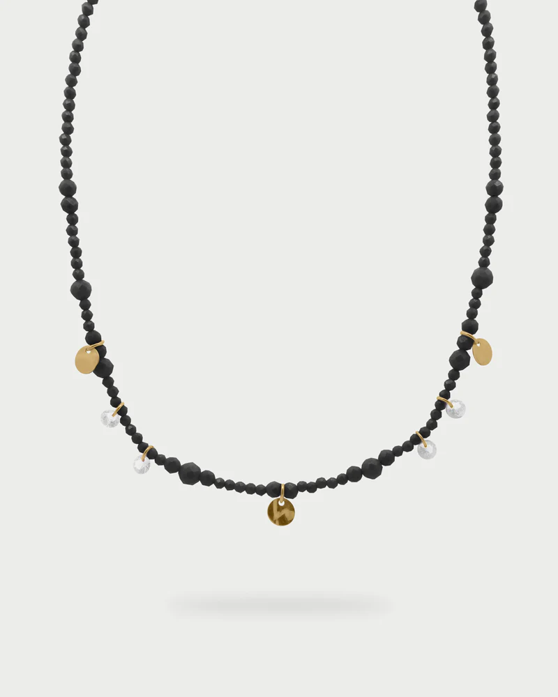 Girocollo in argento dorato con zirconi milky pendenti e medaglie decorative. Un equilibrio perfetto tra luce, movimento e simboli.