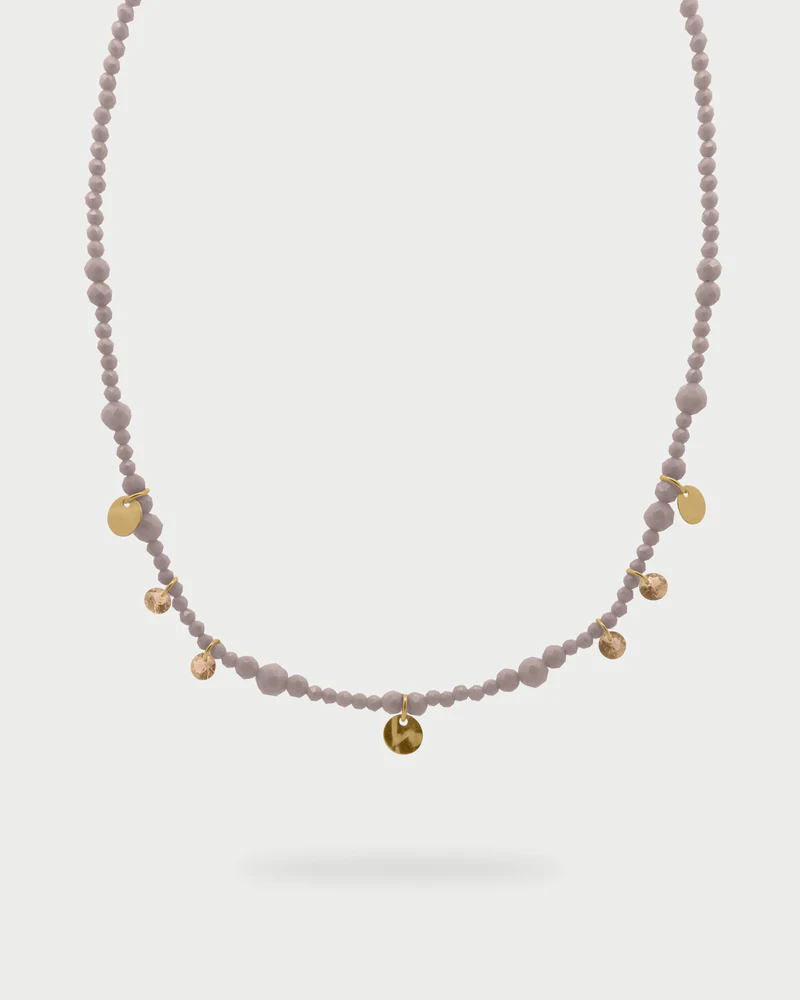 Girocollo in argento dorato con zirconi milky pendenti e medaglie decorative. Un equilibrio perfetto tra luce, movimento e simboli.