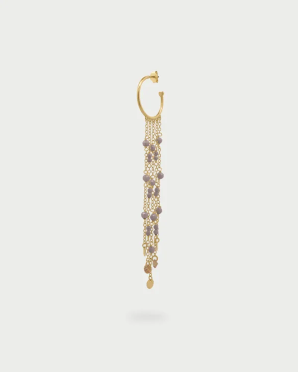 Mono-orecchino cerchio lungo in argento dorato con cascata di catene e pendenti scintillanti. Un look forte e raffinato allo stesso tempo.