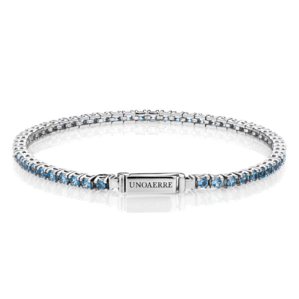 Bracciale Tennis in argento 925 con pietre zirconia cubica azzurre e chiusura a cassetta con logo. L’eleganza intramontabile di un gioiello iconico si tinge di un delicato azzurro cielo ed è subito magia. Segui il trend mix-and-match ed indossalo insieme agli altri bracciali Tennis colorati.