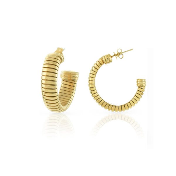 Orecchini a cerchio aperto sul retro in maglia “Tubogas”. Chiusura con perno farfallina. Minimal look ed eleganza dal fascino moderno per questi insoliti, graziosissimi cerchietti. Abbinali agli altri gioielli della linea Tubogas per una parure pensata apposta per chi ama sorprendere.